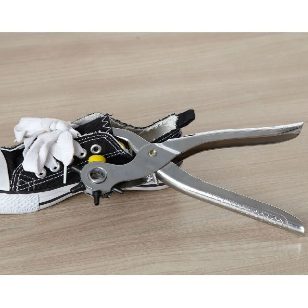 Pince à rivets, métal, 75 accessoires inclus. Elle sert à percer des trous, fixer des boutons pressions et ajouter des oeillets. S’utilise sur le cuir, le vinyle, le plastique et le tissus.