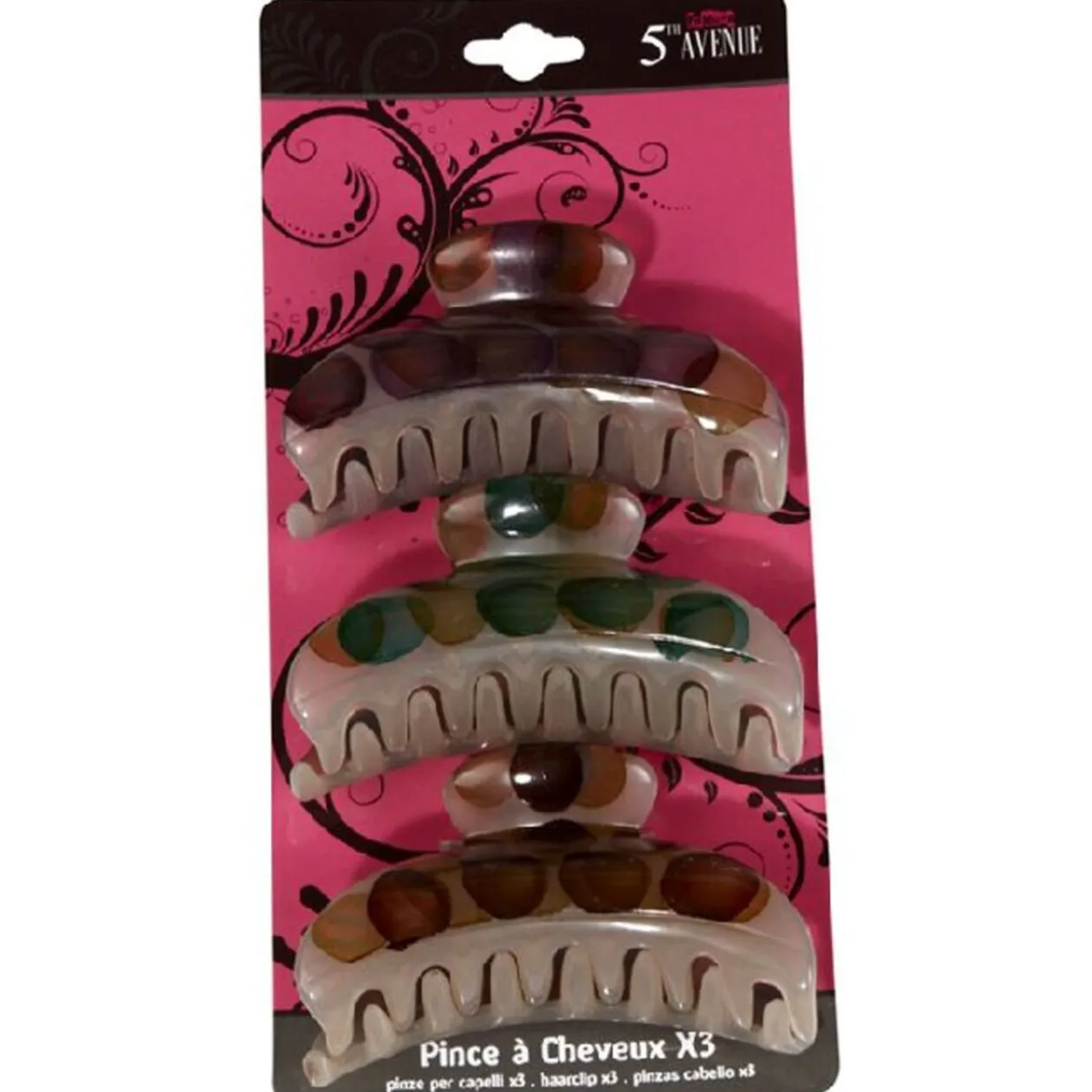 3 pinces à cheveux de dim. 8,5x3x4 cm, plastique.