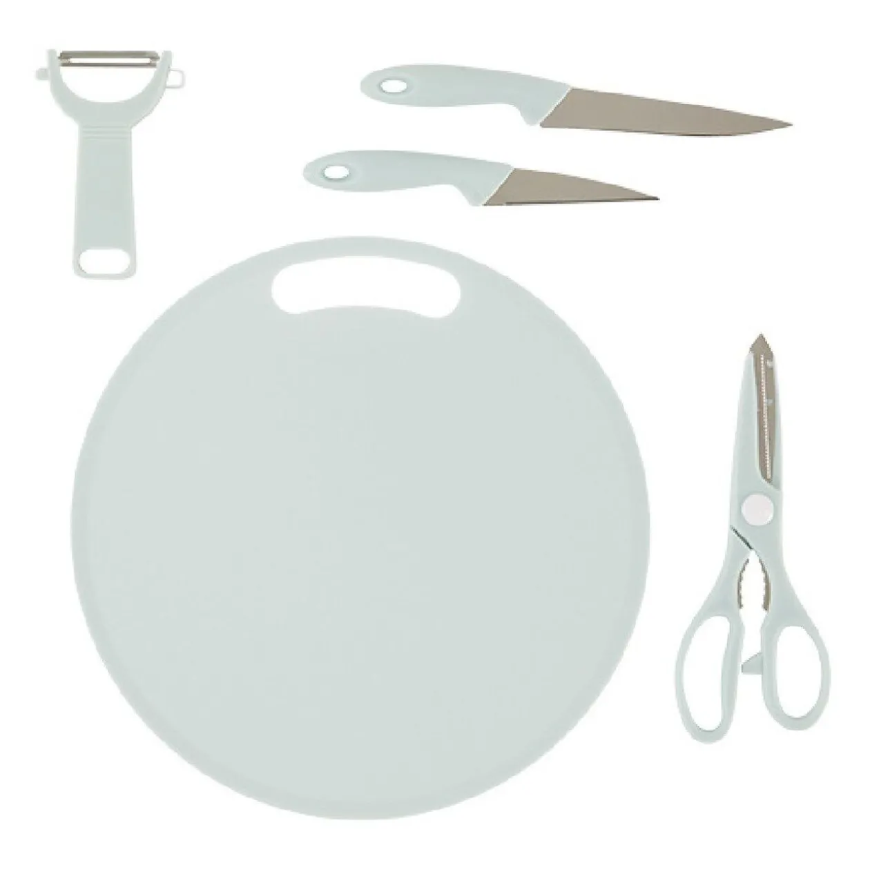 Contient une planche à découper + un ciseau + un éplucheur + 2 couteauxCe produit existe en 3 modèles/coloris, modèle aléatoire selon disponibilité en magasin- Couleur : Blanc / Bleu / Noir- Dimensions : D31,7 x H3cm- Matière(s) : Inox