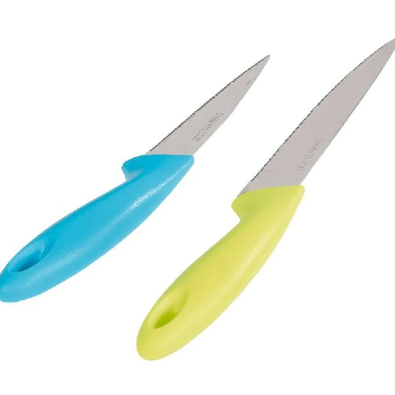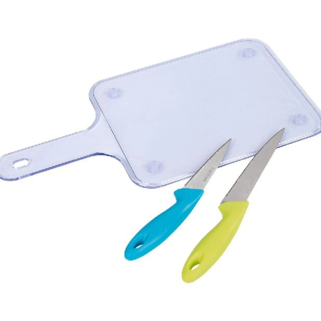 Set de découpe comprenant 2 couteaux lame acier inoxydable, manche ergonomique et 1 planche à découper dim. 35,5×23,5 cm.