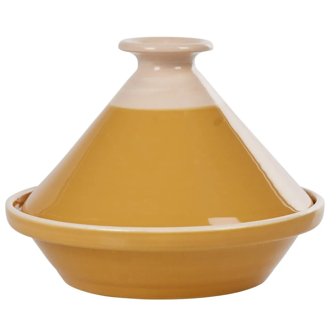 Plat à tajine en faïence jaune moutarde avec rebords blancs ivoire.