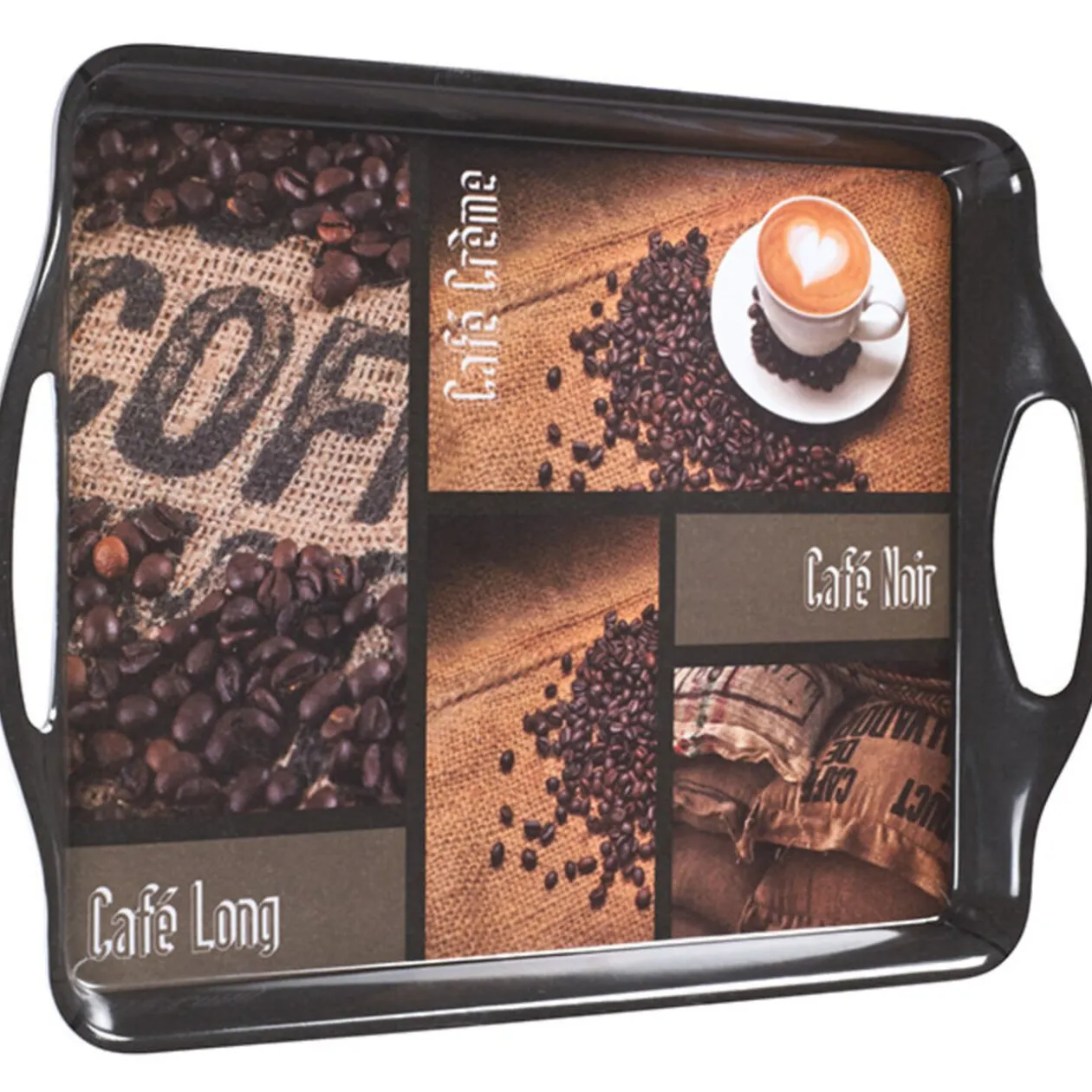 Plateau au motif Café, muni de 2 poignées pour une meilleure prise en main. Matière : plastique mélaminé. Dimensions : 50,5×34,5×3,3 cm.