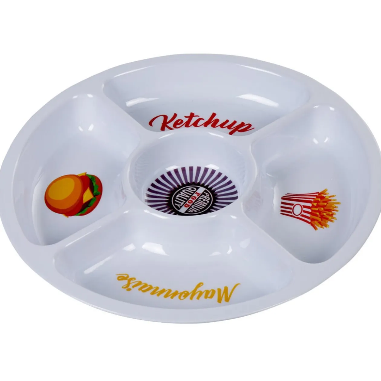 Optez pour ce plateau rond en plastique mélaminé design fast food composé de 5 compartiments, il vous servira pour la présentation des mini-burgers, frites et sauces variées mais aussi pour le service des petits apéritifs.