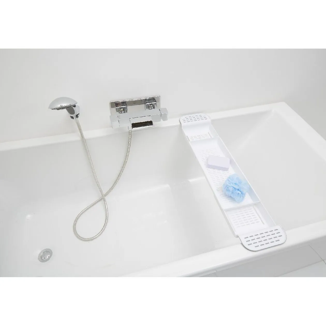 Pont de baignoire avec plateau extensible de 55 à 78 cm. s’adapte à la plupart des baignoires standard. Idéal pour garder à disposition les produits et accessoires de bain.