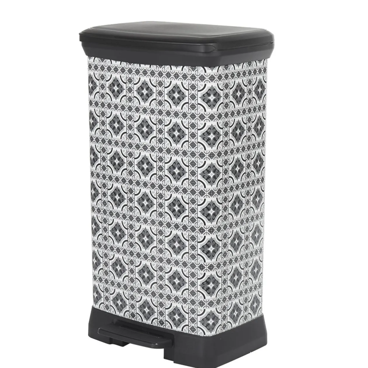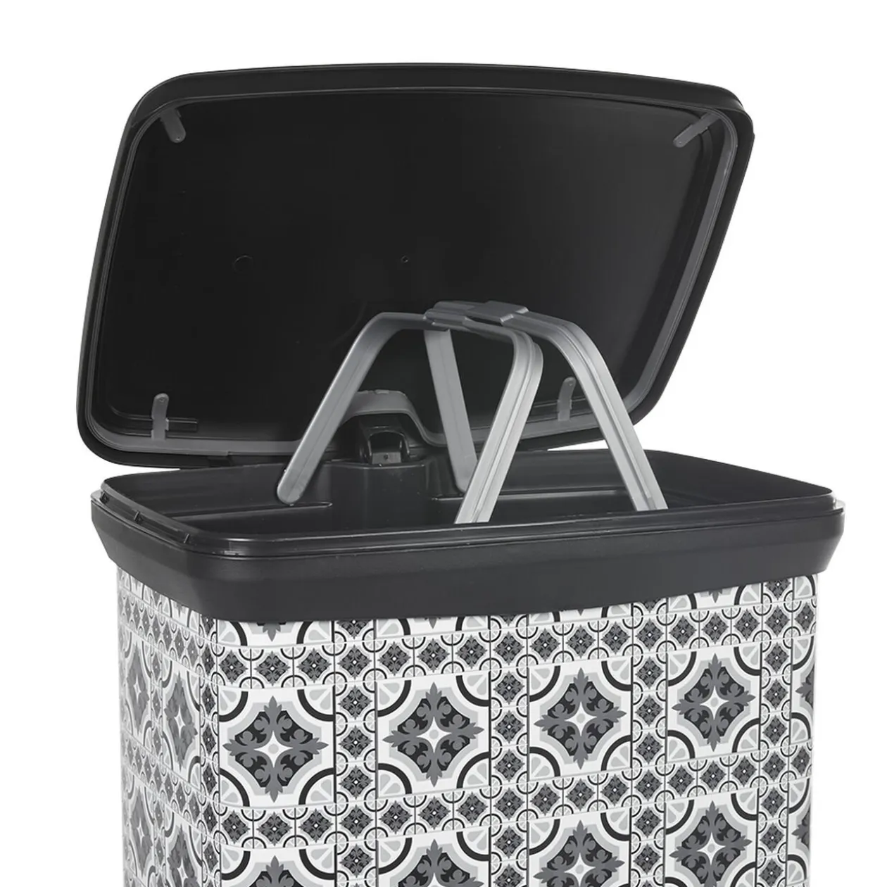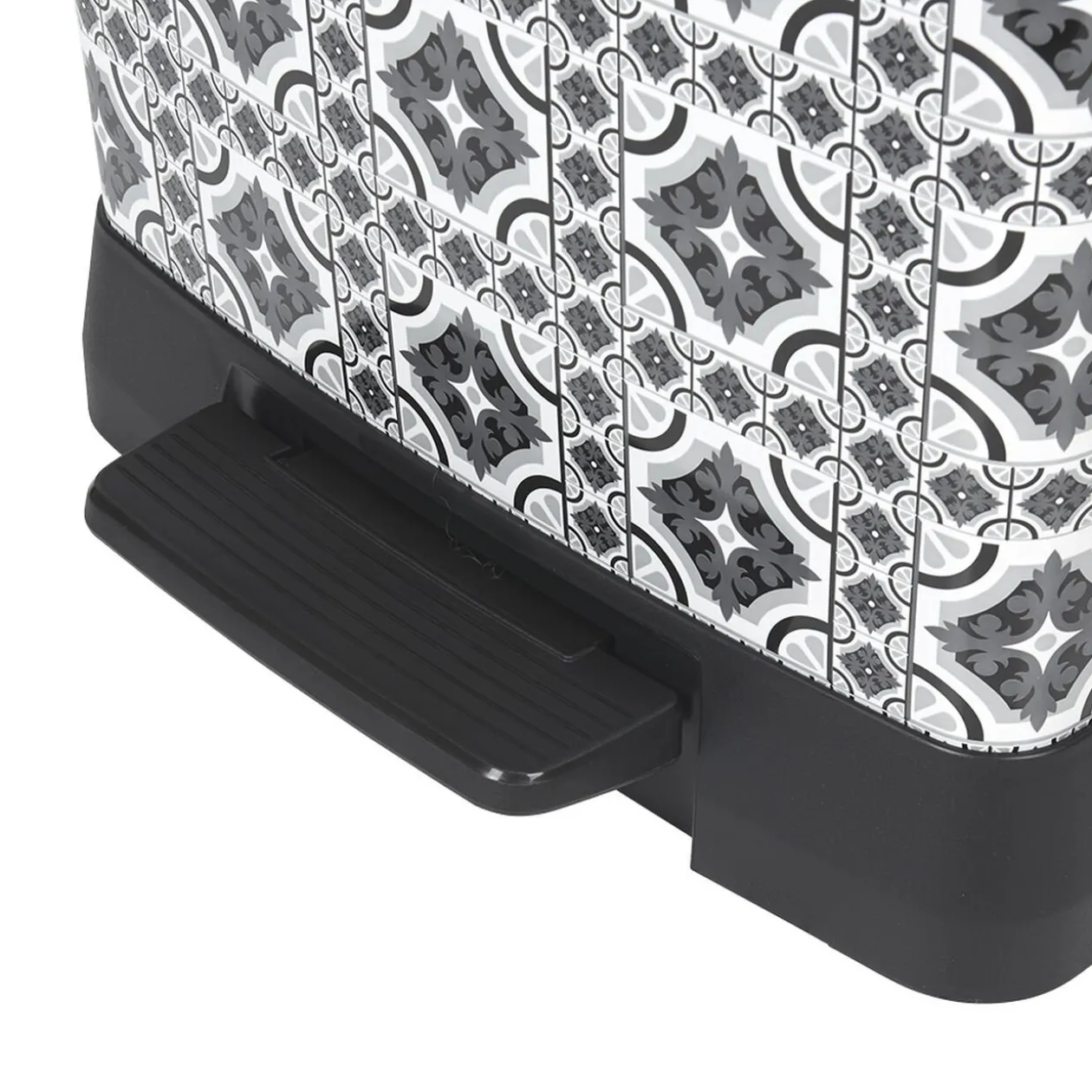 Poubelle à pédale avec motifs carreaux de ciment de couleur grise et blanche. Sa contenance de 50 litres vous permettra de stocker plus de déchets qu’habituellement !