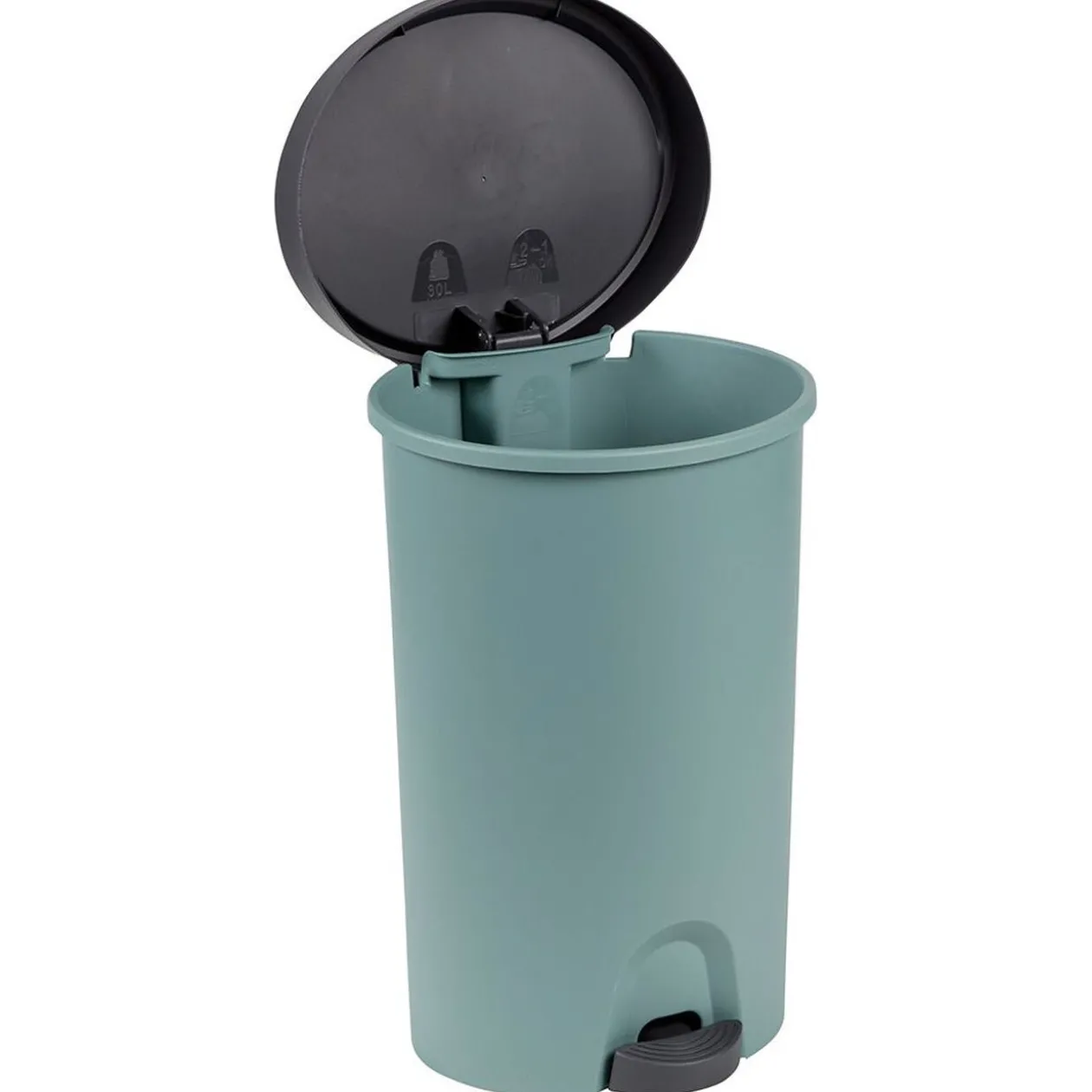 Poubelle à pédale bicolore verte et grise d’une contenance de 27 litres.