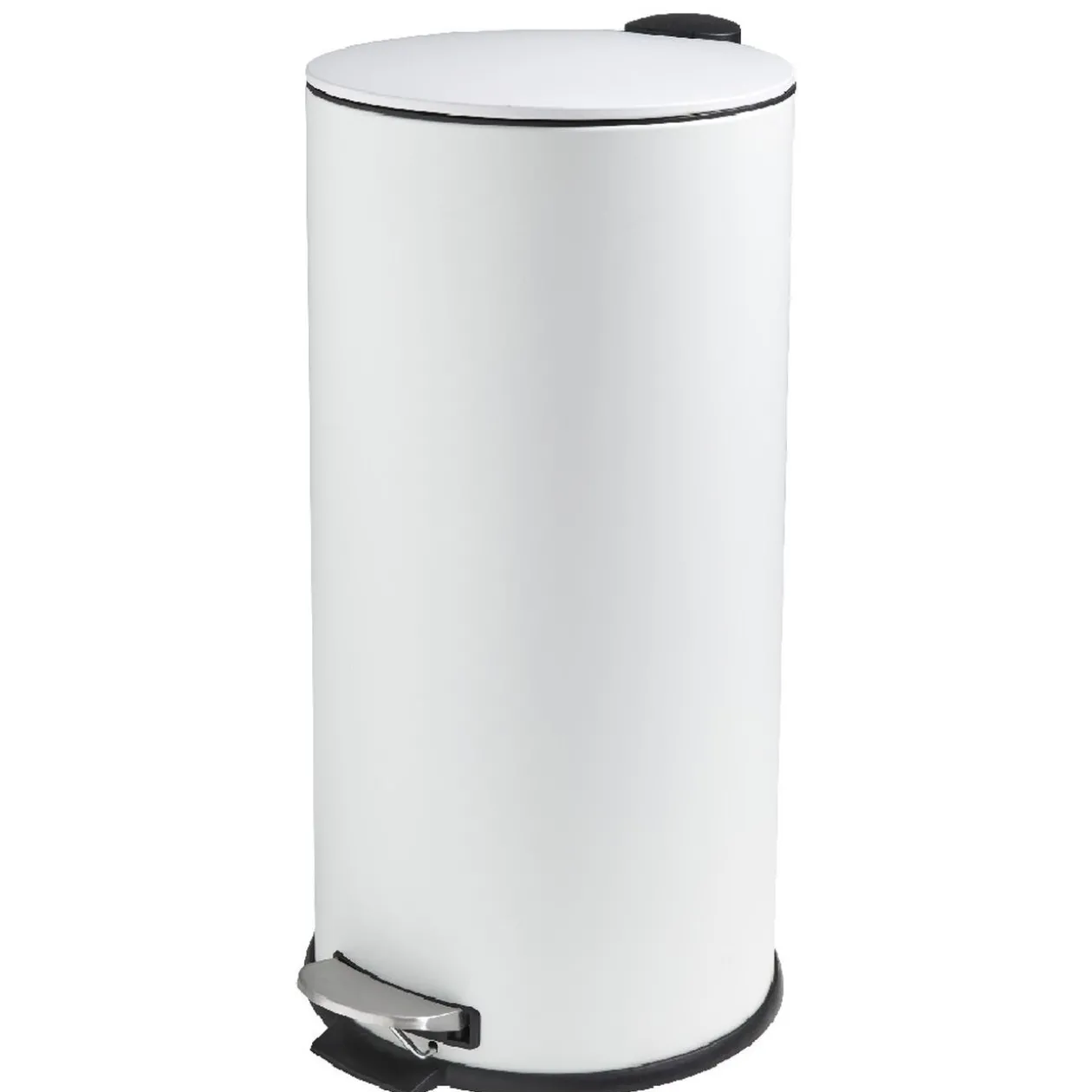 Poubelle ronde à pédale en métal et plastique blanc. Design épuré facile à intégrer dans tous les styles de décorations.