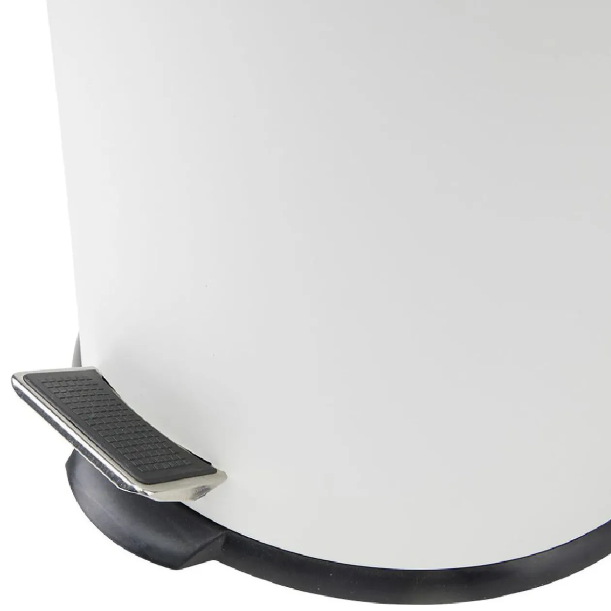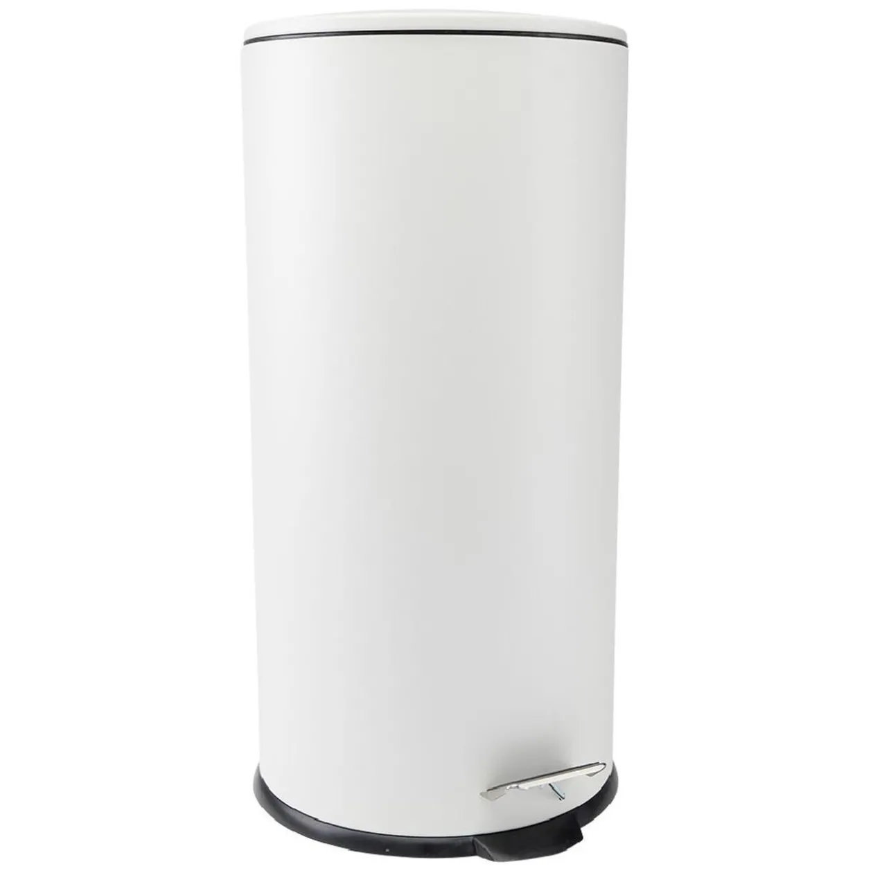 Poubelle ronde à pédale en métal et plastique blanc. Design épuré facile à intégrer dans tous les styles de décorations.