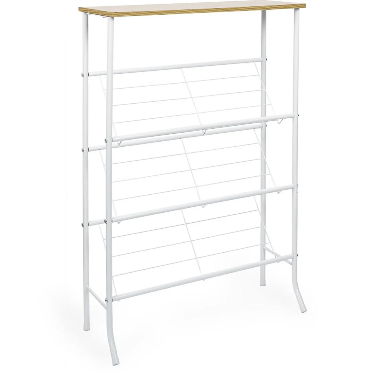 Optimisez votre espace avec ce range-chaussures en métal blanc vous permettant d’entreposer jusqu’à 9 paires. Une tablette en bois se trouve sur le dessus afin de pouvoir y disposer des accessoires ou bien des objets déco.