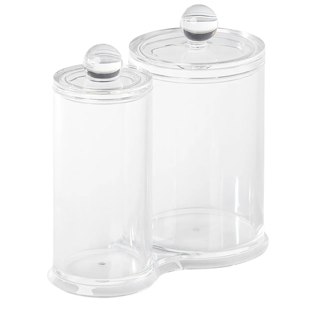 Range coton transparents avec deux éléments fixes pour y ranger vos disques de coton et vos cotons-tiges. Idéals pour optimiser le rangement de votre salle de bain !
