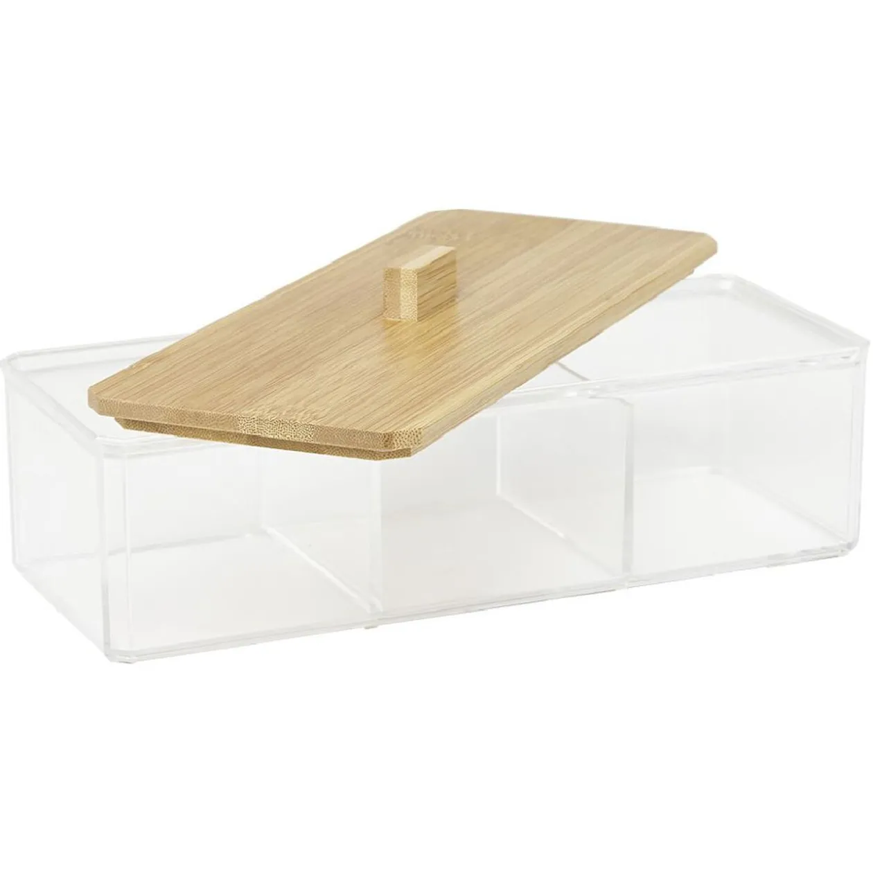 Rangement rectangulaire transparent avec un couvercle en bambou pour y mettre vos cotons tiges.