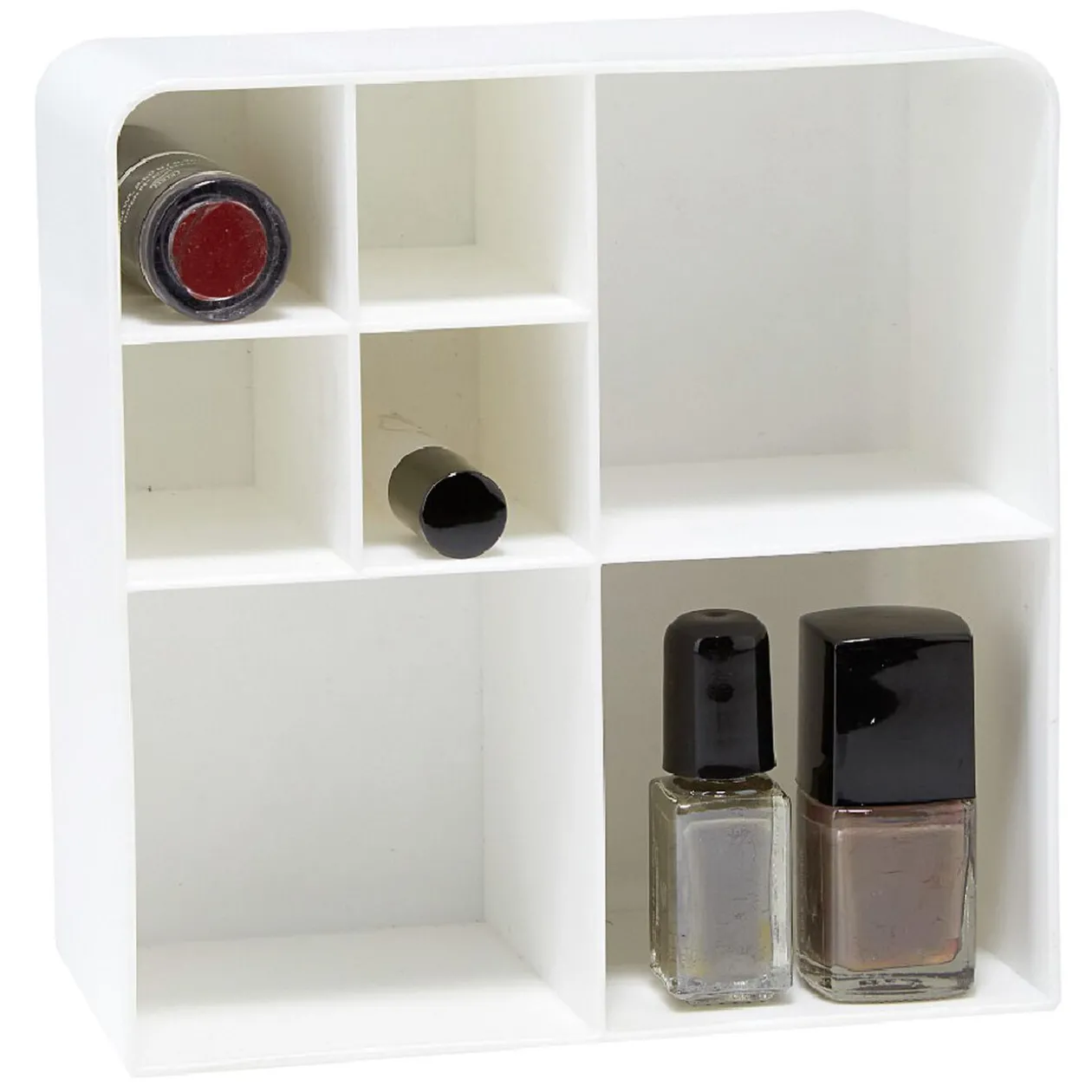 Organisez vos produits cosmétiques grâce à ce rangement en plastique blanc.