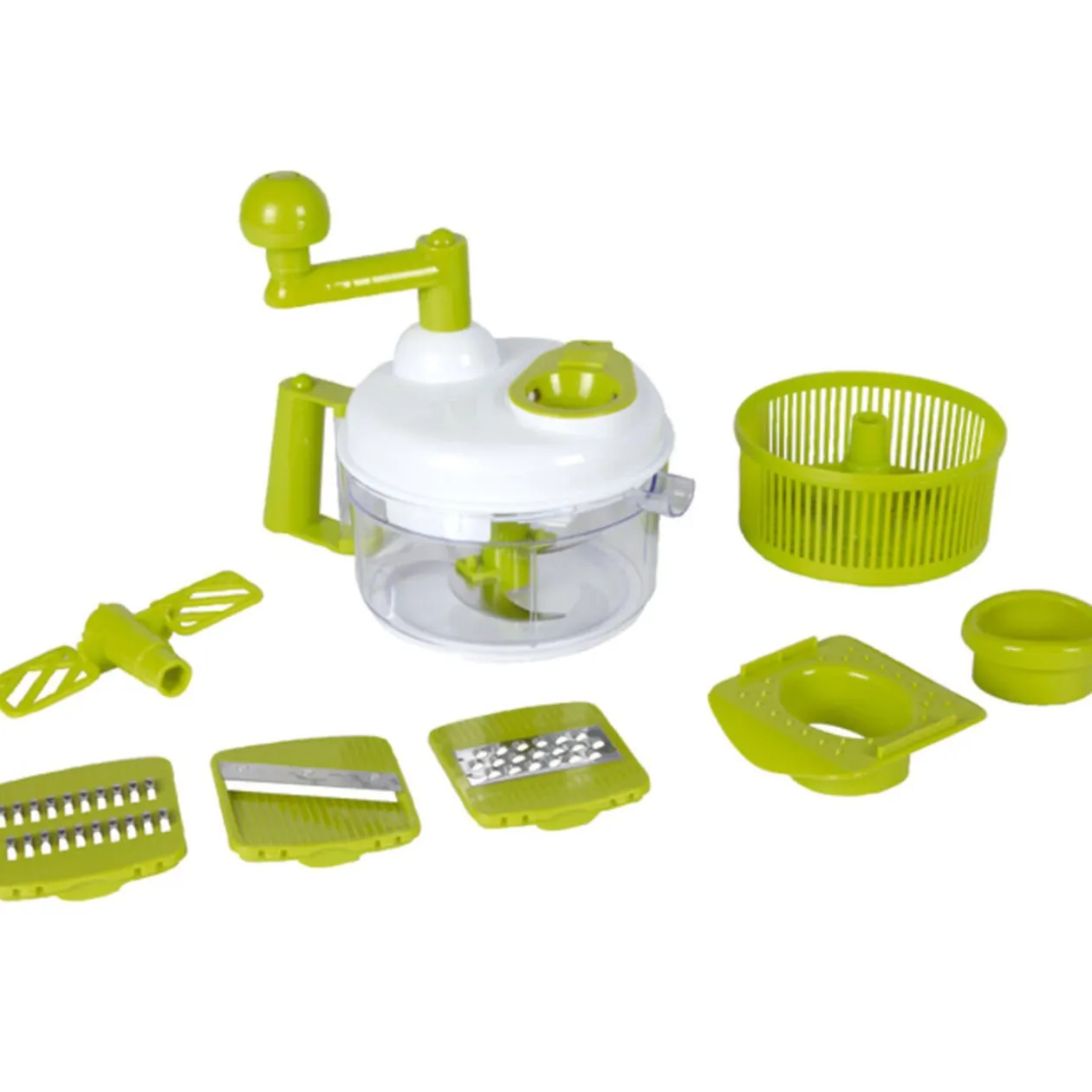 Robot manuel / essoreur à salade, 3 lames (râpe, julienne, tranche), monte les blancs en neige, sépare les blancs des jaunes. Dim. Ø 16 cm, h. 23 cm, plastique.