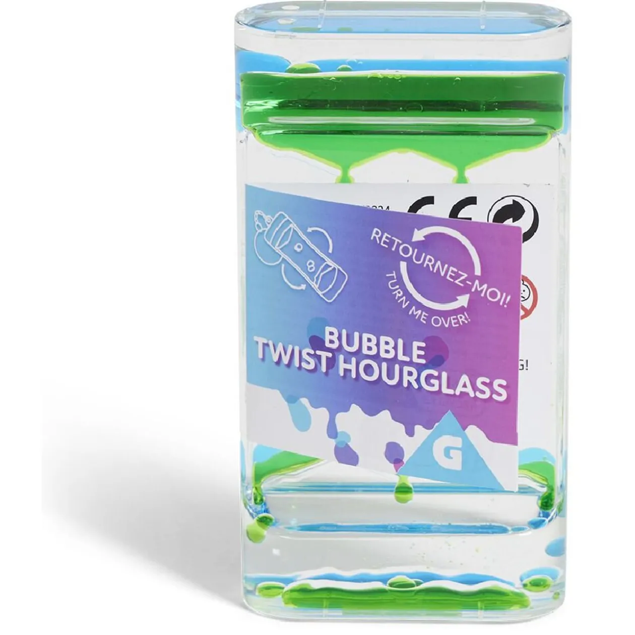 Rempli de liquide coloré, ce sablier crée des bulles et des formes amusantes lorsque tu le retournes d’un sens à l’autre.