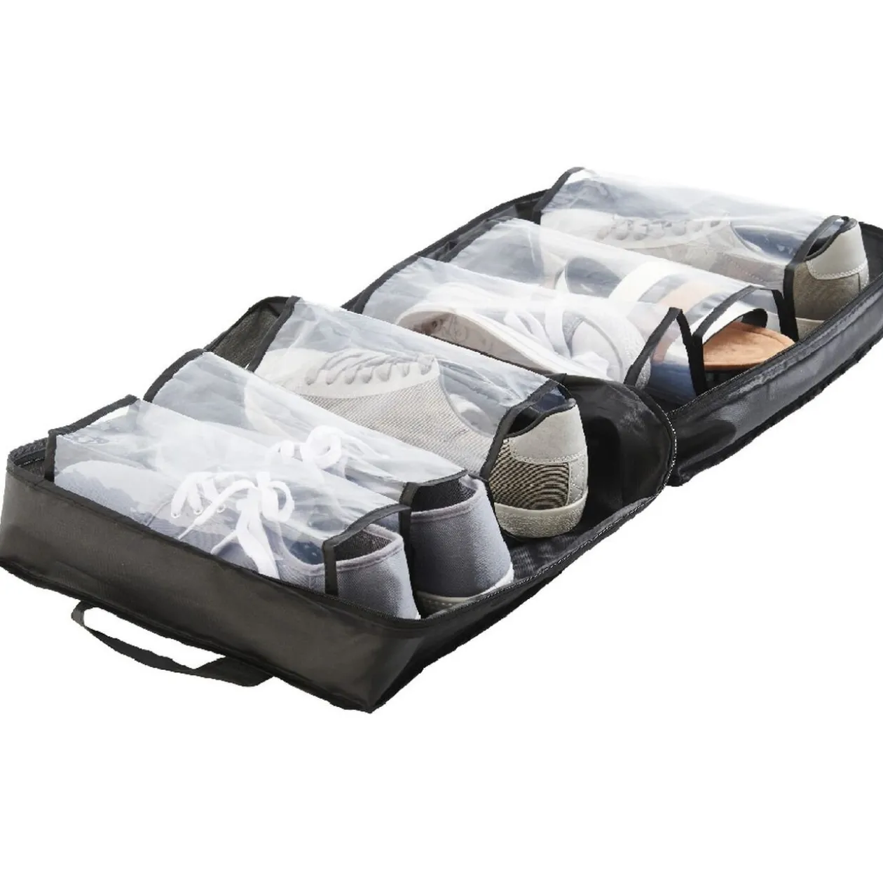 Léger et peu encombrant, ce sac range-chaussures est doté de 2×3 compartiments en PVC transparent pour accueillir 3 à 6 paires de chaussures, pantoufles, tongs…