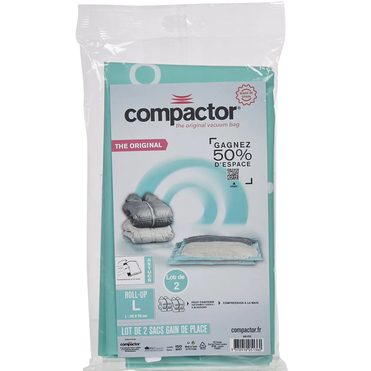Emmenez toute votre armoire dans votre valise, même si vous ne partez qu’un week-end, maintenant c’est possible. Grâce à ces deux sacs vide air, prenez tout ce dont vous aurez besoin ou pas sans culpabiliser et gagnez 50 % d’espace en plus. Glissez l’équivalent de 2 doudounes dans chaque sac, zippez la fermeture, roulez le sac sur lui-même et c’est parti pour votre séjour.