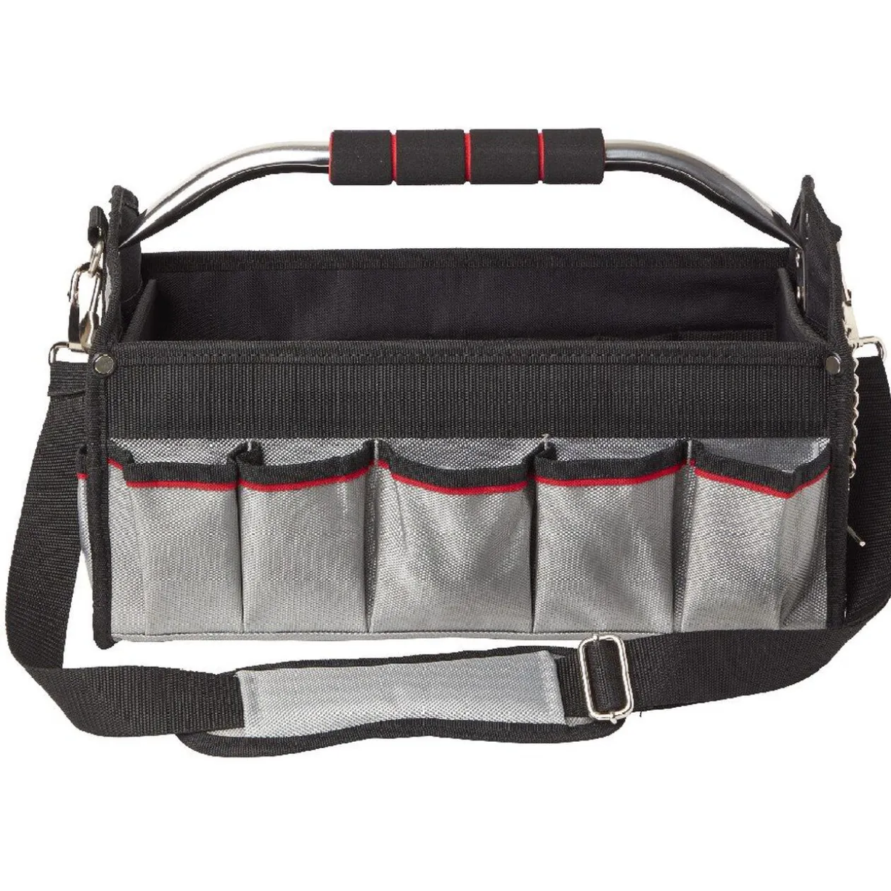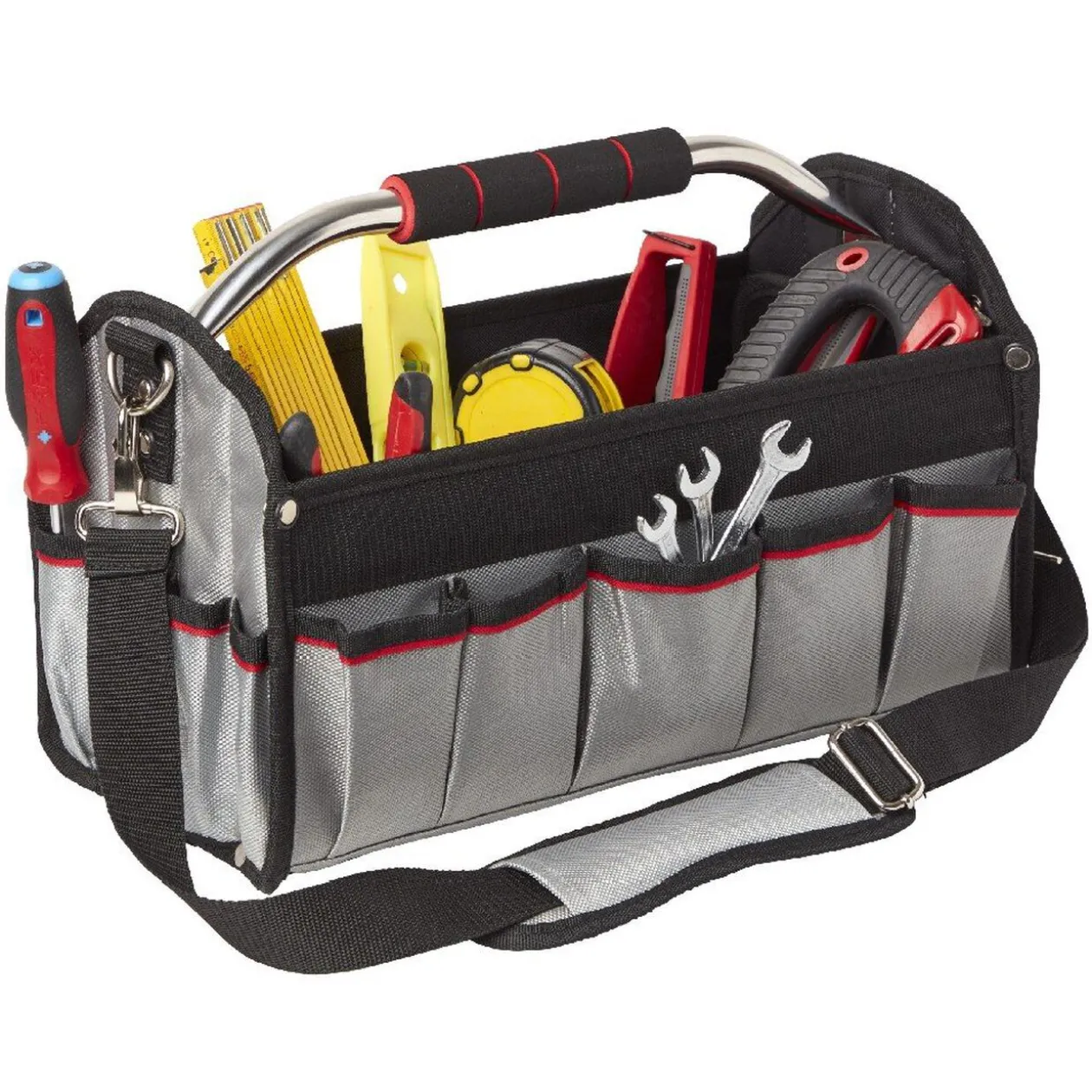 Sacoche avec emplacement pour les outils et équipée d’une poignée en métal renforcée.