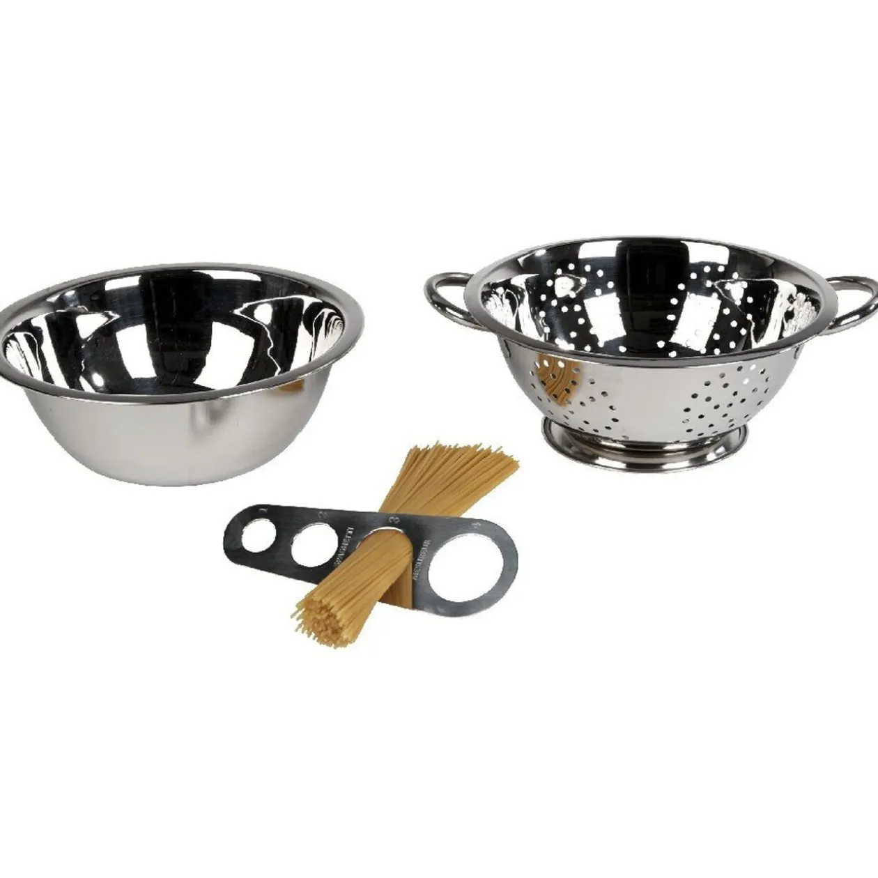 Service à spaghetti 3 pièces comprenant 1 passoire dim. Ø24xh.9,5 cm, 1 saladier ø 24 cm et 1 doseur L. 18 cm, inox.