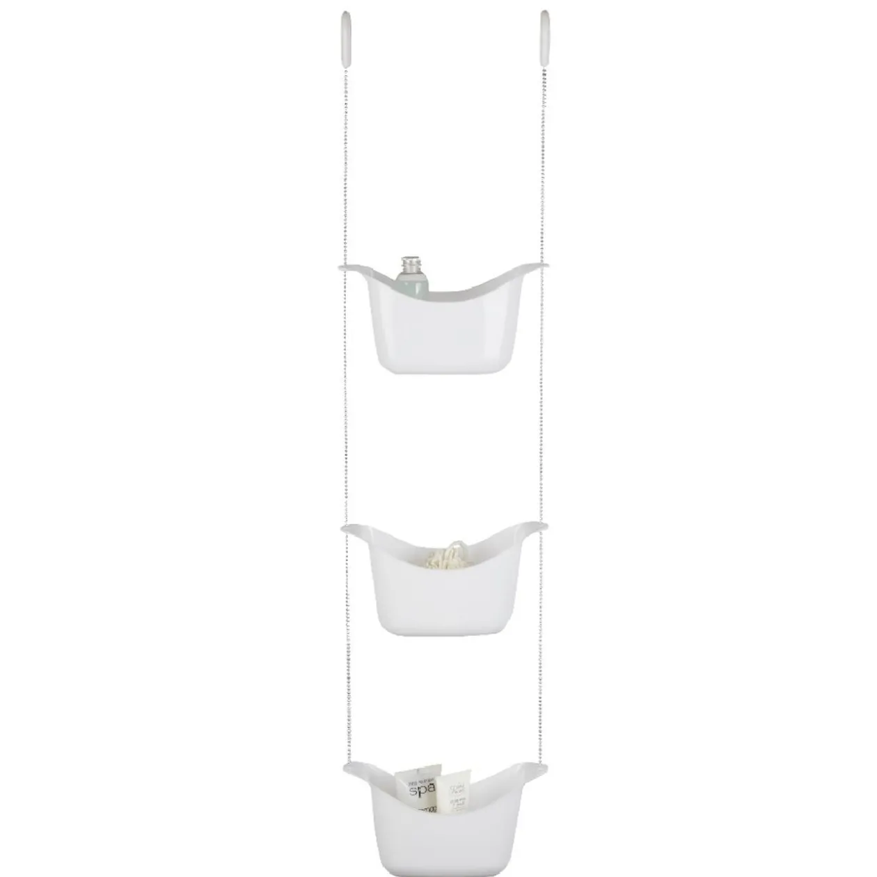 Ce serviteur sur 3 étages avec ses 3 panières blanches à suspendre vous offrira du rangement supplémentaire dans la douche.