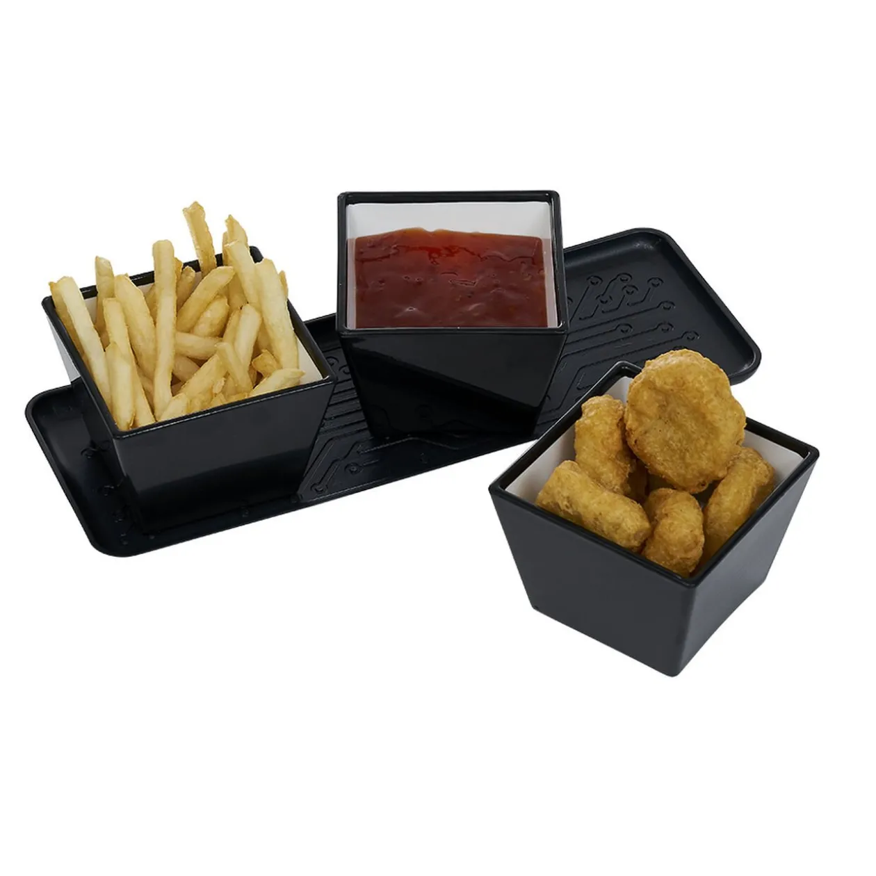 Égayez vos apéritifs en y apportant une touche « geek » avec notre set apéritif. Sauces, gateaux, petits-fours, … prenez plaisir à mettre une touche « de clavier » à vos soirées entre amis. Ce set est composé de 3 coupelles et d’un support pour les transporter.