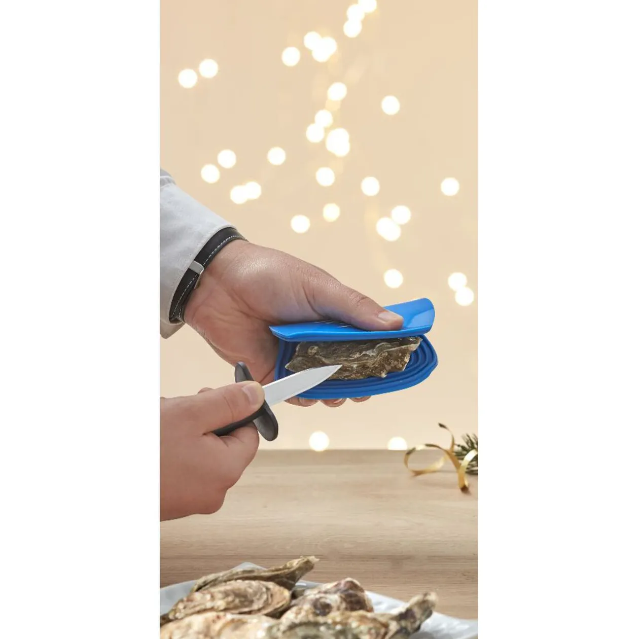 Set à huîtres comprenant 1 couteau avec lame en inox et 1 cale en silicone permettant de maintenir la coquille en toute sécurité pendant l’ouverture.