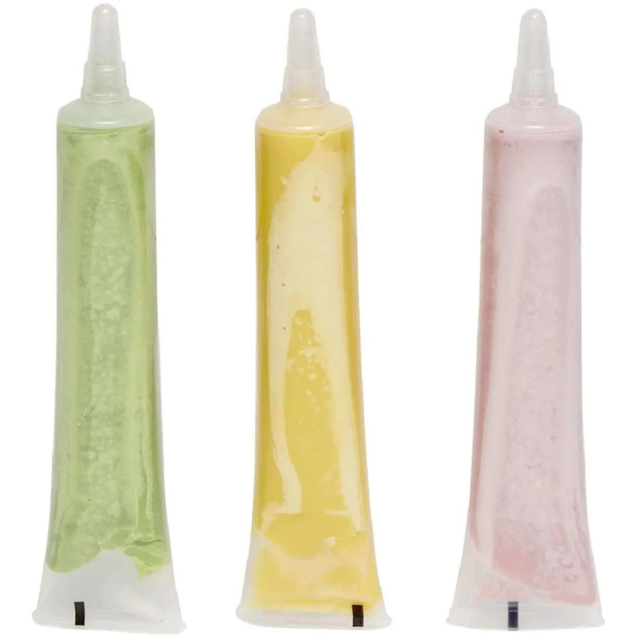 Lot de 3 stylos chococolats de couleur jaune, rose et verte.