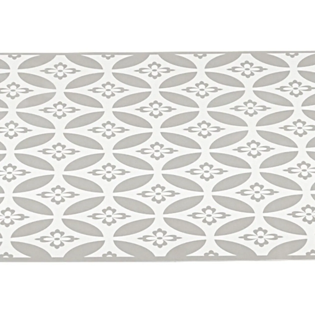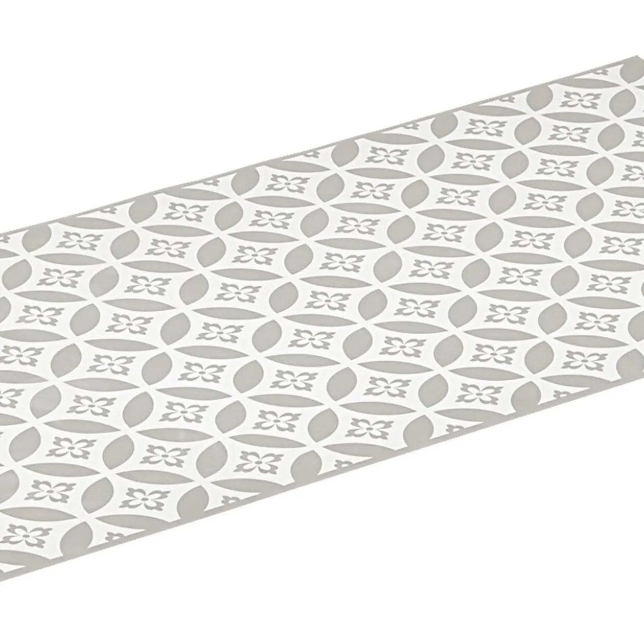 Tapis de cuisine en vinyle rectangulaire imprimé rosace blanc et gris.