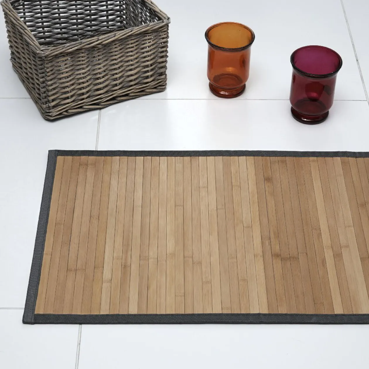 Ce tapis en bambou marron et à bordure grise apportera une touche exotique et tendance à votre salle de bain.