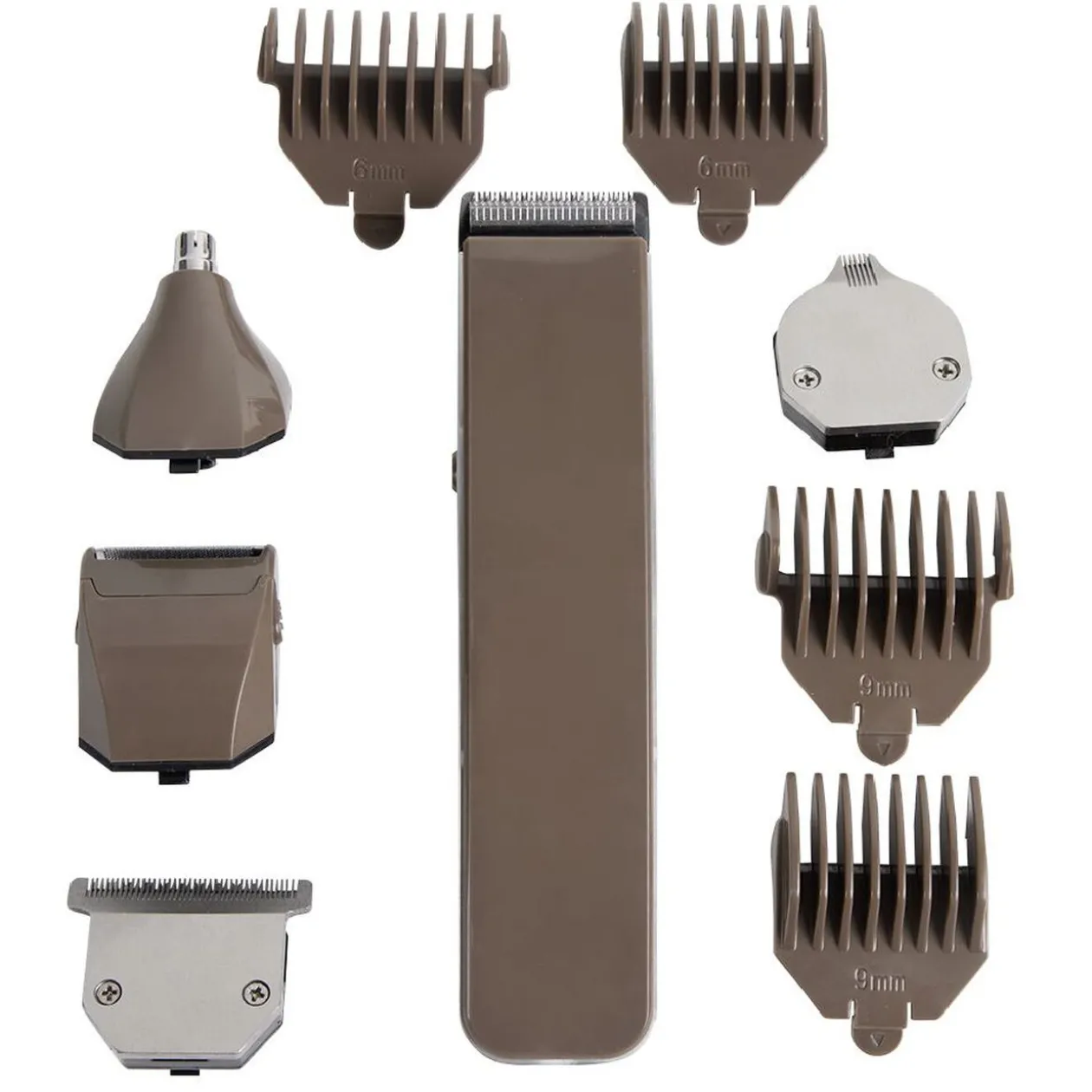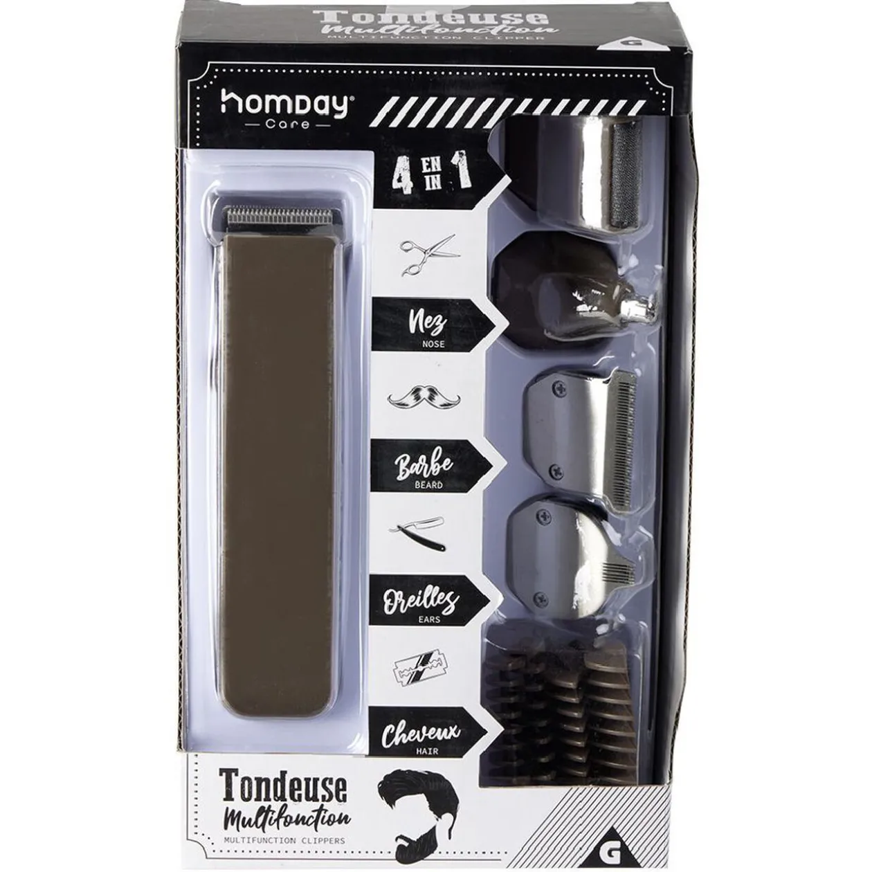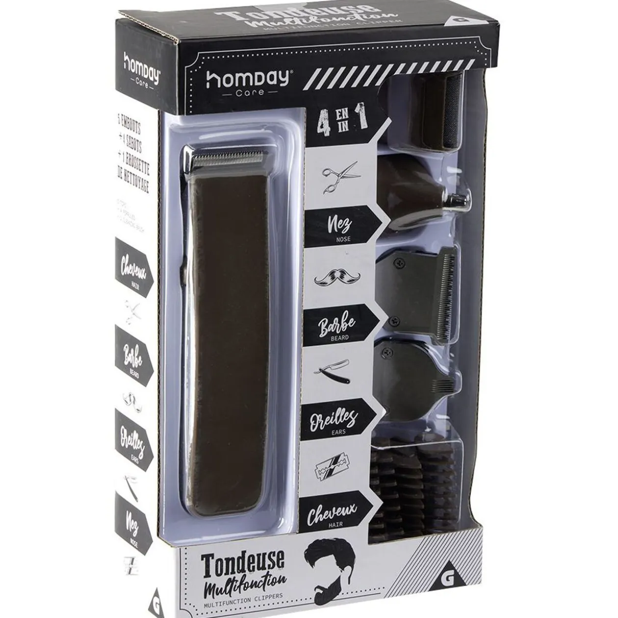 Tondeuse multifonction livrée avec 4 sabots (pour cheveux, barbe, oreilles et nez) ainsi qu’une brossette de nettoyage.