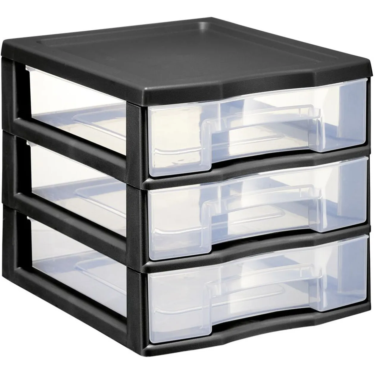 Tour de rangement en plastique noir composée de 3 tiroirs au format A6. Idéale pour organiser vos affaires dans le bureau ou l’atelier.