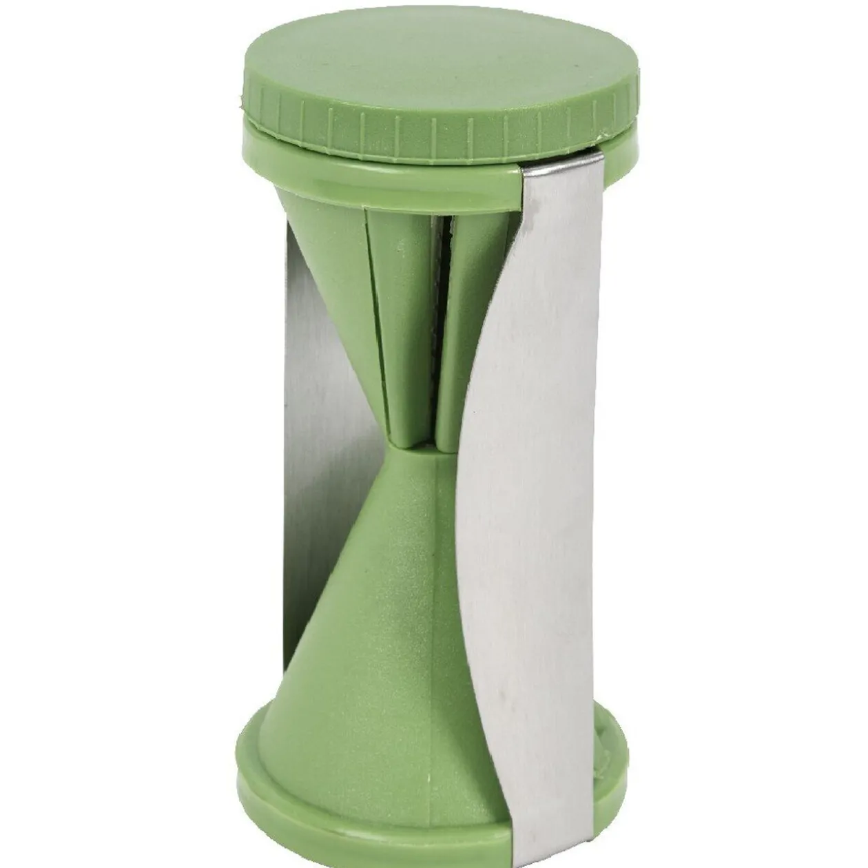 Trancheuse à spirale en plastique vert. Facile d’utilisation: tourner pour trancher. Dimension: 12 x 7 x 7 cm.